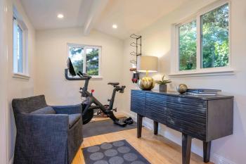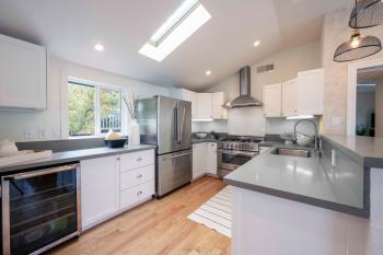 Fabulously remodeled three bedroom plus detached office, two bath contemporary with an open-concept floor plan, cathedral ceilings, abundant natural light and stunning Mt. Tam views. Privately set on a gated, large, lushly landscaped, lot amidst beautiful lawns, gardens, and mature greenery. Gourmet chef’s kitchen with elegant honed-quartz countertops and stainless appliances. The generous living/family room is the main gathering space and features a custom travertine gas fireplace and, along with the formal dining room, opens to the spacious view deck for easy outdoor dining and entertaining. Splendid, private primary suite on the main level with a large walk-in closet, luxurious bath and private deck. Two additional bedrooms grace the lower level, along with a den/media room, laundry and access to the lower covered deck, magnificent grounds and the detached office/exercise room. Hardwood floors throughout. Incredibly peaceful and close to many of the most beautiful hiking and biking trails, and beaches in Marin, yet just minutes to the amenities of downtown Mill Valley.