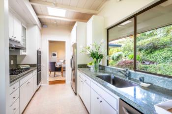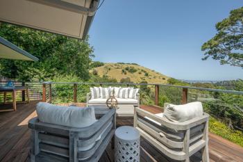 Experience the serenity of this light-filled contemporary three bedroom, three bath home, nestled in a private setting amidst lush gardens on a peaceful street in Old Tiburon. Every room opens to expansive decks and patios, offering breathtaking 270-degree views, spanning the nearby 110-acre Martha Property Open Space, the East Bay, Keil Cove, Raccoon Straits, Angel Island, San Francisco, the Bay, and the Golden Gate Bridge. This meticulously maintained home offers a perfect blend of comfort and tasteful elegance featuring a living room with walls of windows and a custom limestone fireplace, a chef’s kitchen with stunning granite slab countertops and stainless appliances, aformal dining room, open beam ceilings, and random plank hardwood floors. The private primary bedroom offers panoramic views. Additional amenities include a large laundry room and a two-car garage with interior access. Enjoy the proximity to open space, the ferry, shops, restaurants, and all the amenities downtown Tiburon has to offer.