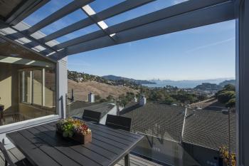 Enjoy inspiring panoramic views of the San Francisco skyline, Angel Island, Alcatraz, Old Saint Hilary’s Church and the Bay from every room of this well-appointed, luxury contemporary townhouse-style condominium in a rarely available, ten-unit complex. Enter into an expansive “great room” with a dramatic, soaring open-beam cathedral ceiling and oak hardwood floors. Relax in the living room by the fireplace or dine outdoors on the adjacent deck with glass railings for unobstructed views. Custom kitchen with stainless appliances. Formal dining area with windows on two sides. Den/library area for lounging (and possible third bedroom). The lower level features a luxurious master suite and a spacious second bedroom, each with a private deck, along with a bonus office or gym. Two car parking. Storage. Easy access to trails and pathways and downtown Tiburon’s ferries, shops and many amenities.